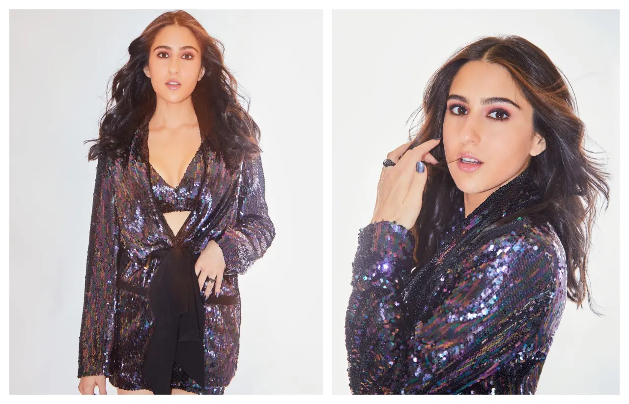 सारा अली खान ने ग्लिटर को-ऑर्ड आउटफिट पहना है।